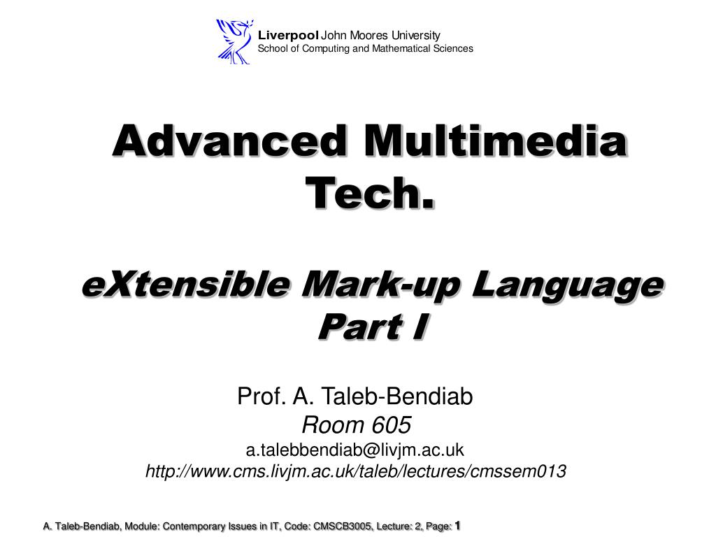 Advanced Multimedia Tech.eXtensible Mark-up Language Part I Prof. A. Taleb-Bendiab Room 605 a.talebbendiab@livjm.ac.uk http://www.cms.livjm.ac.uk/taleb/lectures/cmssem013