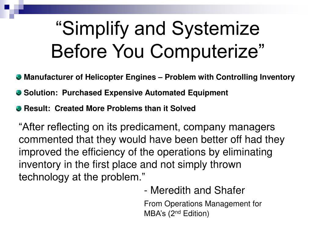 “Simplify and Systemize Before You Computerize” Manufacturer of Helicopter Engines – Problem with Controlling Inventory “After reflecting on its predicament, company managers commented that they would have been better off had they improved the efficiency of the operations by eliminating inventory in the first place and not simply thrown technology at the problem.” - Meredith and Shafer From Operations Management for MBA’s (2nd Edition) Solution: Purchased Expensive Automated Equipment Result: Created More Problems than it Solved