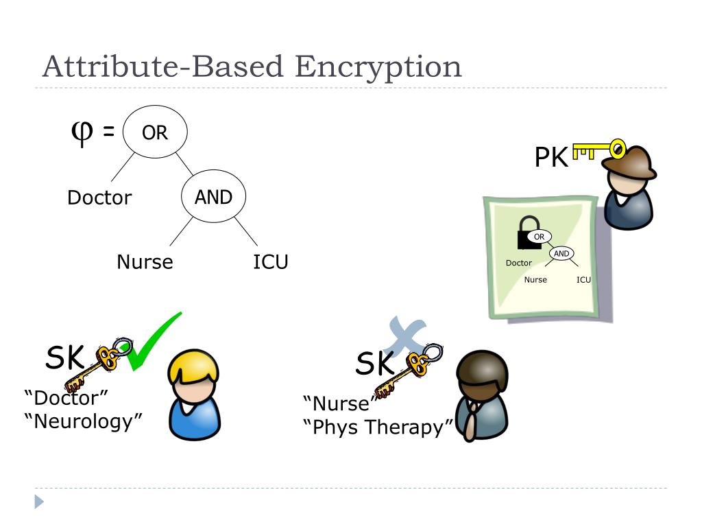 OR OR SK SK AND AND Doctor Doctor Nurse ICU Nurse ICU Attribute-Based Encryption = PK “Doctor” “Neurology” “Nurse” “Phys Therapy”