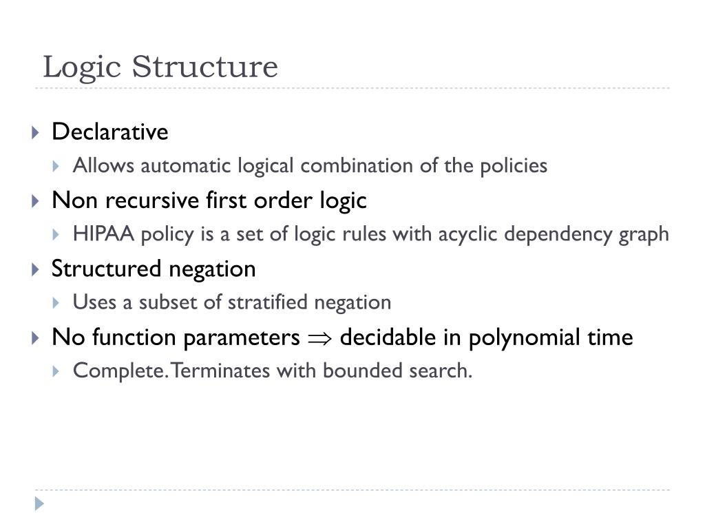 Logic Structure • Declarative • Allows automatic logical combination of the policies • Non recursive first order logic • HIPAA policy is a set of logic rules with acyclic dependency graph • Structured negation • Uses a subset of stratified negation • No function parameters decidable in polynomial time • Complete. Terminates with bounded search.