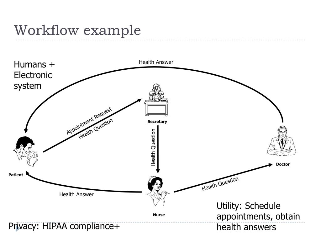 Workflow example Humans + Electronic system Health Answer Appointment Request Secretary Health Question Health Question Doctor Patient Health Question Health Answer Utility: Schedule appointments, obtain health answers Nurse Privacy: HIPAA compliance+