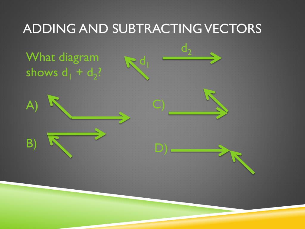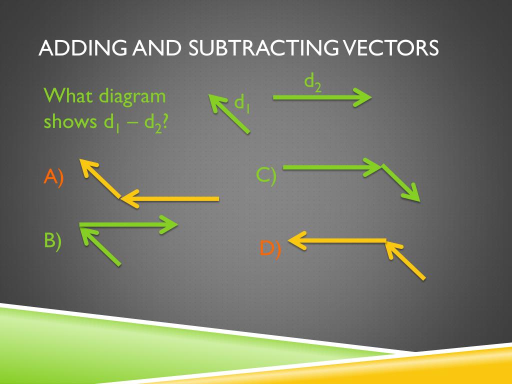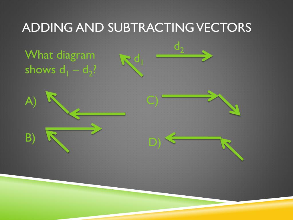 Adding and subtracting vectors d2 What diagram shows d1 – d2? d1 C) A) B) D)