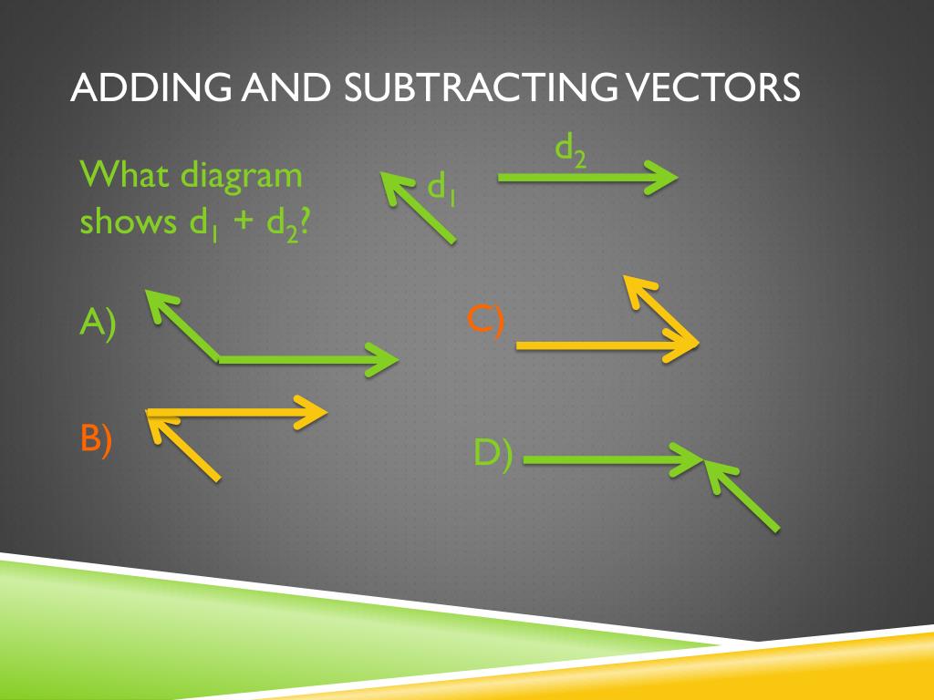 Adding and subtracting vectors d2 What diagram shows d1 + d2? d1 C) A) B) D)