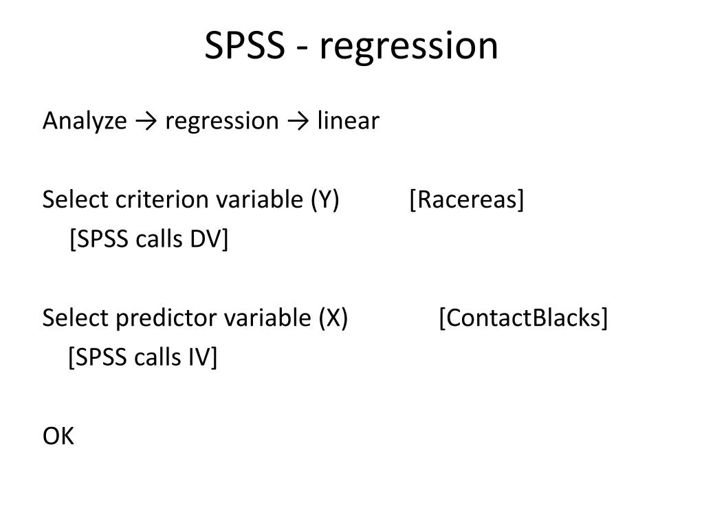 SPSS - regression Analyze → regression → linear Select criterion variable (Y) [Racereas] [SPSS calls DV] Select predictor variable (X) [ContactBlacks] [SPSS calls IV] OK