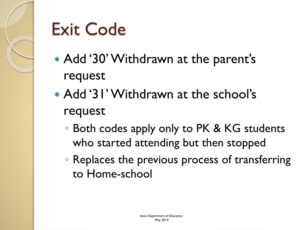 Exit Code • Add ‘30’ Withdrawn at the parent’s request • Add ‘31’ Withdrawn at the school’s request • Both codes apply only to PK & KG students who started attending but then stopped • Replaces the previous process of transferring to Home-school Iowa Department of Education May 2014
