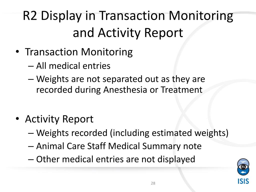 R2 Display in Transaction Monitoring and Activity Report • Transaction Monitoring • All medical entries • Weights are not separated out as they are recorded during Anesthesia or Treatment • Activity Report • Weights recorded (including estimated weights) • Animal Care Staff Medical Summary note • Other medical entries are not displayed