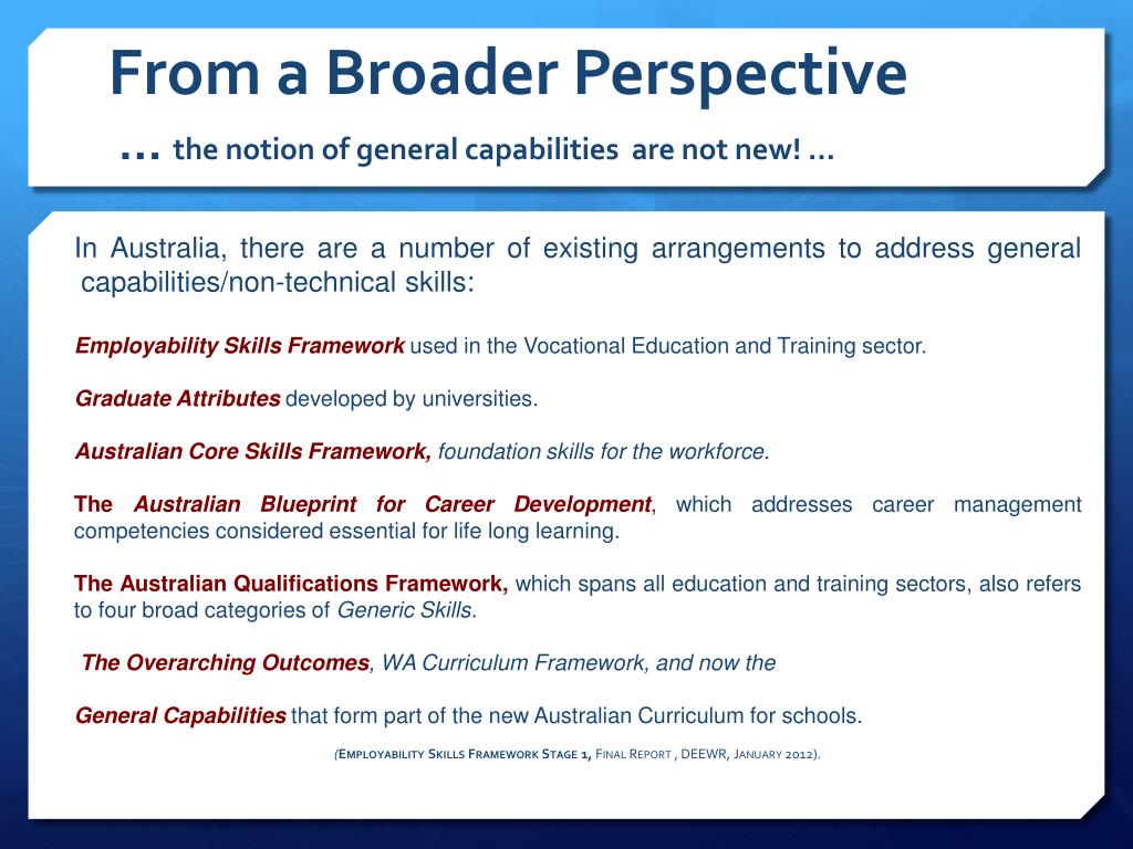 From a Broader Perspective … the notion of general capabilities are not new! … In Australia, there are a number of existing arrangements to address general capabilities/non-technical skills: Employability Skills Frameworkused in the Vocational Education and Training sector. Graduate Attributesdeveloped by universities. Australian Core Skills Framework, foundation skills for the workforce. The Australian Blueprint for Career Development, which addresses career management competencies considered essential for life long learning. The Australian Qualifications Framework, which spans all education and training sectors, also refers to four broad categories of Generic Skills. The Overarching Outcomes, WA Curriculum Framework, and now the General Capabilities that form part of the new Australian Curriculum for schools. (Employability Skills Framework Stage 1, Final Report , DEEWR, January 2012).