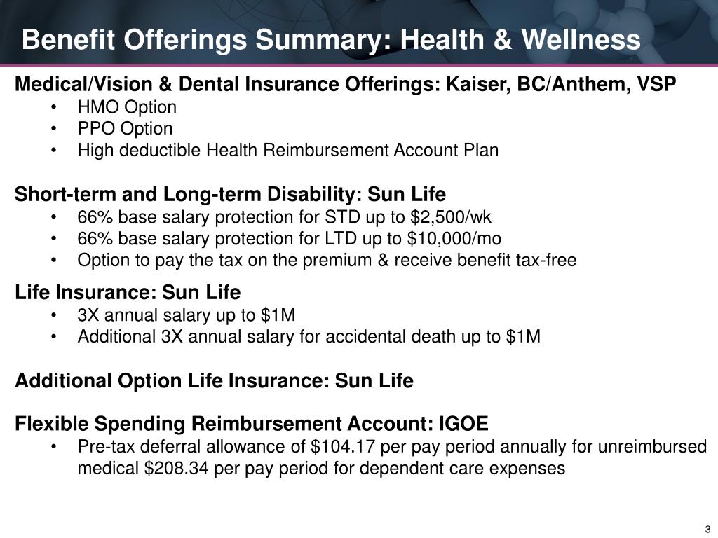 Benefit Offerings Summary: Health & Wellness • Medical/Vision & Dental Insurance Offerings: Kaiser, BC/Anthem, VSP • HMO Option • PPO Option • High deductible Health Reimbursement Account Plan • Short-term and Long-term Disability: Sun Life • 66% base salary protection for STD up to $2,500/wk • 66% base salary protection for LTD up to $10,000/mo • Option to pay the tax on the premium & receive benefit tax-free • Life Insurance: Sun Life • 3X annual salary up to $1M • Additional 3X annual salary for accidental death up to $1M • Additional Option Life Insurance: Sun Life • Flexible Spending Reimbursement Account: IGOE • Pre-tax deferral allowance of $104.17 per pay period annually for unreimbursed medical $208.34 per pay period for dependent care expenses 3