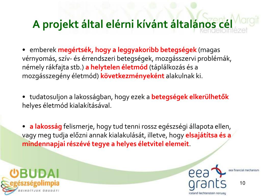 A projekt által elérni kívánt általános cél emberek megértsék, hogy a leggyakoribb betegségek (magas vérnyomás, szív- és érrendszeri betegségek, mozgásszervi problémák, némely rákfajta stb.) a helytelen életmód (táplálkozás és a mozgásszegény életmód) következményeként alakulnak ki. tudatosuljon a lakosságban, hogy ezek a betegségek elkerülhetők helyes életmód kialakításával. a lakosság felismerje, hogy tud tenni rossz egészségi állapota ellen, vagy meg tudja előzni annak kialakulását, illetve, hogy elsajátítsa és a mindennapjai részévé tegye a helyes életvitel elemeit.
