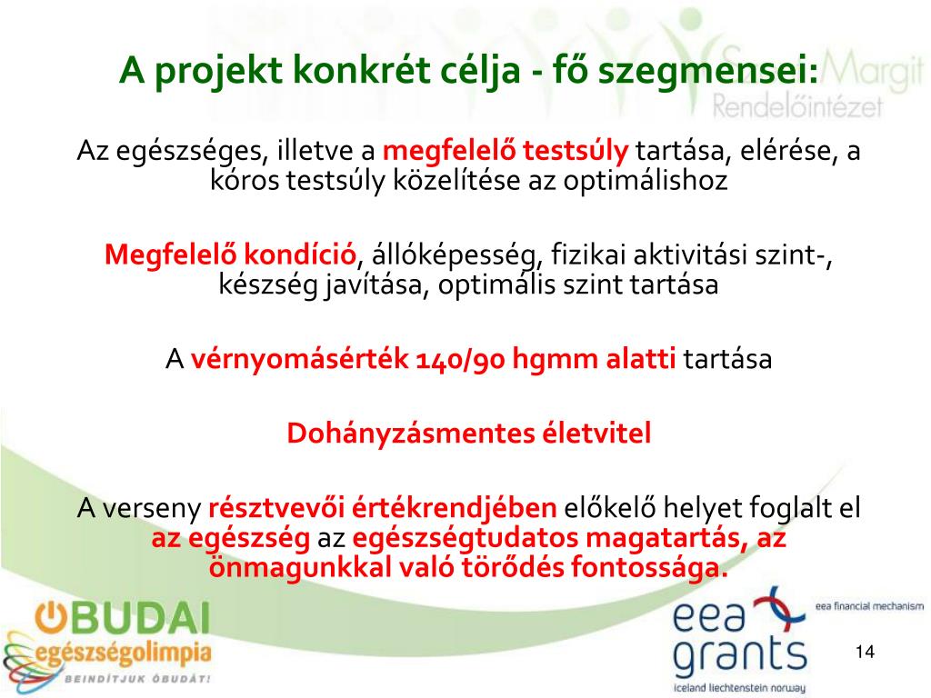 A projekt konkrét célja - fő szegmensei: Az egészséges, illetve a megfelelő testsúly tartása, elérése, a kóros testsúly közelítése az optimálishoz Megfelelő kondíció, állóképesség, fizikai aktivitási szint-, készség javítása, optimális szint tartása A vérnyomásérték 140/90 hgmm alatti tartása Dohányzásmentes életvitel A verseny résztvevői értékrendjében előkelő helyet foglalt el az egészség az egészségtudatos magatartás, az önmagunkkal való törődés fontossága.