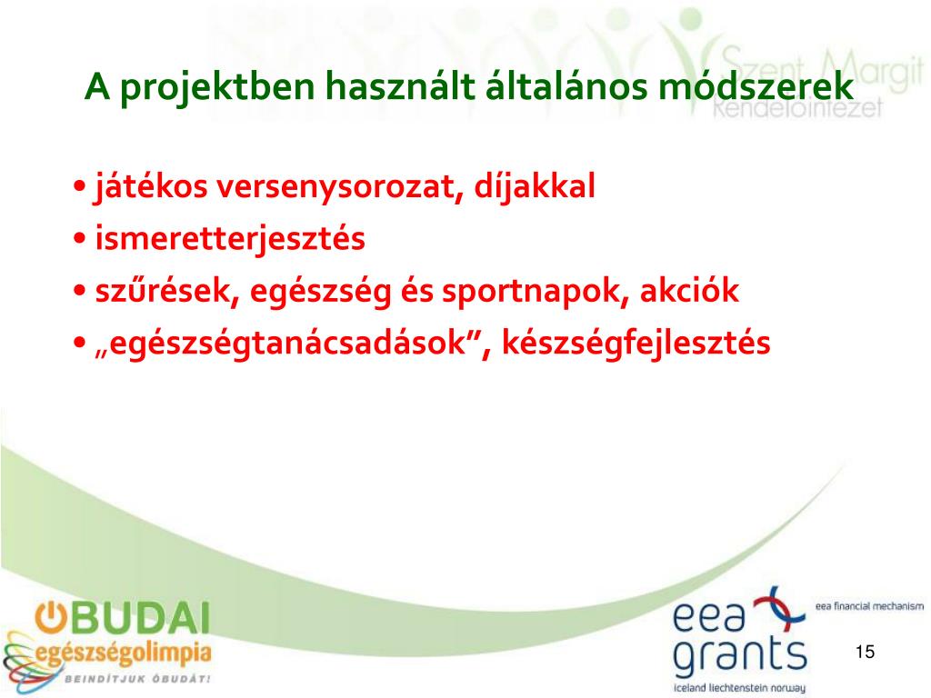 A projektben használt általános módszerek játékos versenysorozat, díjakkal ismeretterjesztés szűrések, egészség és sportnapok, akciók „egészségtanácsadások”, készségfejlesztés