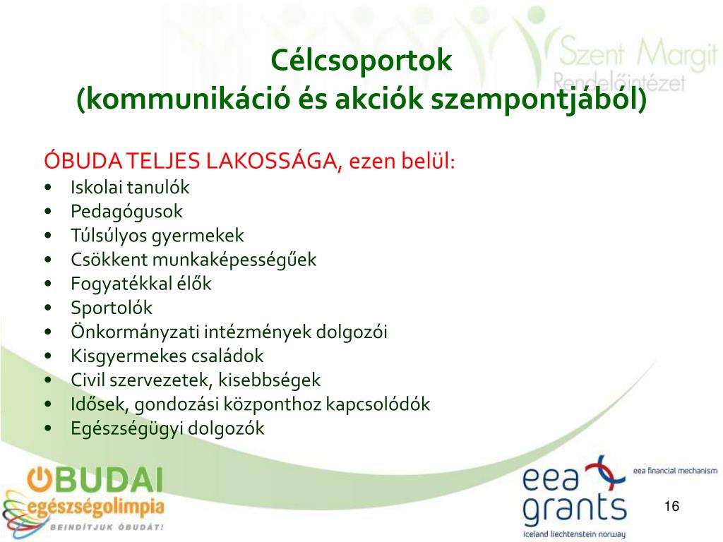 Célcsoportok (kommunikáció és akciók szempontjából) ÓBUDA TELJES LAKOSSÁGA, ezen belül: • Iskolai tanulók • Pedagógusok • Túlsúlyos gyermekek • Csökkent munkaképességűek • Fogyatékkal élők • Sportolók • Önkormányzati intézmények dolgozói • Kisgyermekes családok • Civil szervezetek, kisebbségek • Idősek, gondozási központhoz kapcsolódók • Egészségügyi dolgozók