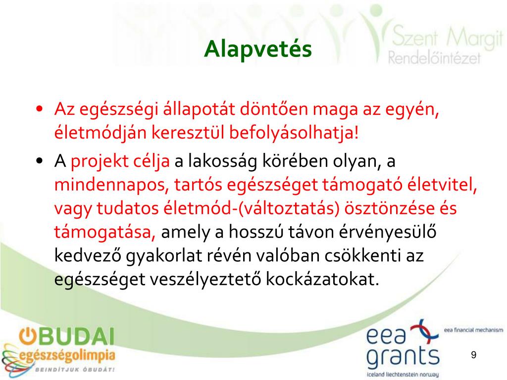 Alapvetés • Az egészségi állapotát döntően maga az egyén, életmódján keresztül befolyásolhatja! • A projekt célja a lakosság körében olyan, a mindennapos, tartós egészséget támogató életvitel, vagy tudatos életmód-(változtatás) ösztönzése és támogatása, amely a hosszú távon érvényesülő kedvező gyakorlat révén valóban csökkenti az egészséget veszélyeztető kockázatokat.