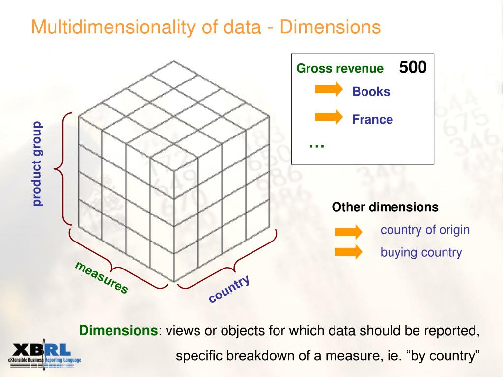 Multidimensionality of data - Dimensions 500 Gross revenue Books France … product group Other dimensions country of origin buying country country measures Dimensions: views or objects for which data should be reported, specific breakdown of a measure, ie. “by country”