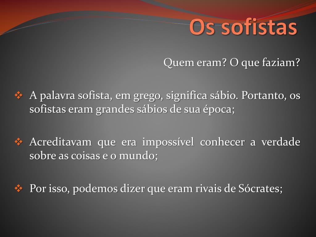 Os sofistas Quem eram? O que faziam? A palavra sofista, em grego, significa sábio. Portanto, os sofistas eram grandes sábios de sua época; Acreditavam que era impossível conhecer a verdade sobre as coisas e o mundo; Por isso, podemos dizer que eram rivais de Sócrates;