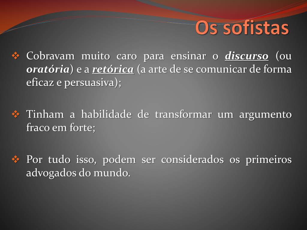 Os sofistas Cobravam muito caro para ensinar o discurso(ou oratória) e a retórica (a arte de se comunicar de forma eficaz e persuasiva); Tinham a habilidade de transformar um argumento fraco em forte; Por tudo isso, podem ser considerados os primeiros advogados do mundo.