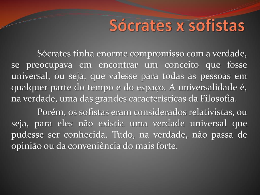 Sócrates x sofistas Sócrates tinha enorme compromisso com a verdade, se preocupava em encontrar um conceito que fosse universal, ou seja, que valesse para todas as pessoas em qualquer parte do tempo e do espaço. A universalidade é, na verdade, uma das grandes características da Filosofia. Porém, os sofistas eram considerados relativistas, ou seja, para eles não existia uma verdade universal que pudesse ser conhecida. Tudo, na verdade, não passa de opinião ou da conveniência do mais forte.