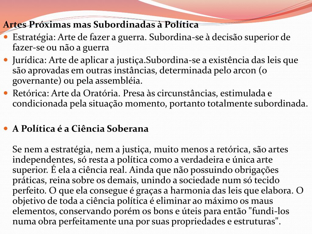 Artes Próximas mas Subordinadas à Política • Estratégia: Arte de fazer a guerra. Subordina-se à decisão superior de fazer-se ou não a guerra • Jurídica: Arte de aplicar a justiça.Subordina-se a existência das leis que são aprovadas em outras instâncias, determinada pelo arcon (o governante) ou pela assembléia. • Retórica: Arte da Oratória. Presa às circunstâncias, estimulada e condicionada pela situação momento, portanto totalmente subordinada. • A Política é a Ciência SoberanaSe nem a estratégia, nem a justiça, muito menos a retórica, são artes independentes, só resta a política como a verdadeira e única arte superior. É ela a ciência real. Ainda que não possuindo obrigações práticas, reina sobre os demais, unindo a sociedade num só tecido perfeito. O que ela consegue é graças a harmonia das leis que elabora. O objetivo de toda a ciência política é eliminar ao máximo os maus elementos, conservando porém os bons e úteis para então "fundi-los numa obra perfeitamente una por suas propriedades e estruturas".