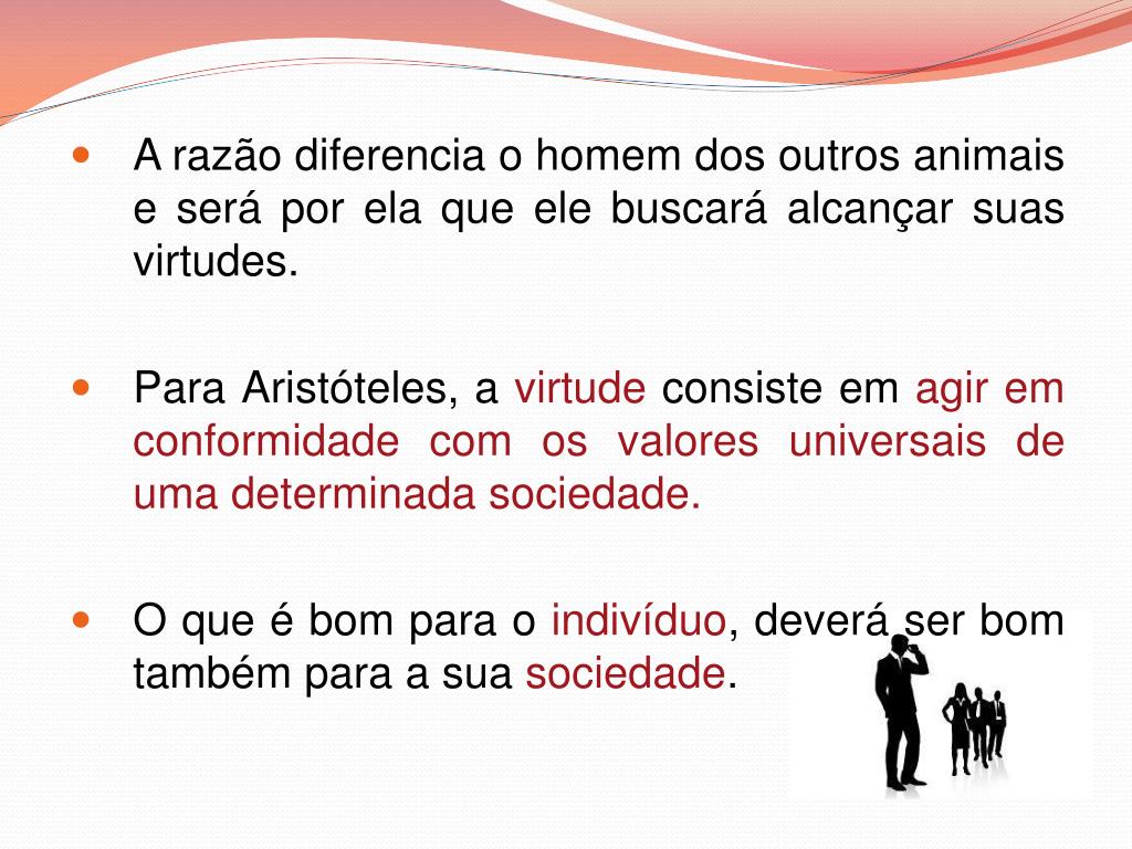 A razão diferencia o homem dos outros animais e será por ela que ele buscará alcançar suas virtudes. • Para Aristóteles, a virtude consiste em agir em conformidade com os valores universais de uma determinada sociedade. • O que é bom para o indivíduo, deverá ser bom também para a sua sociedade.