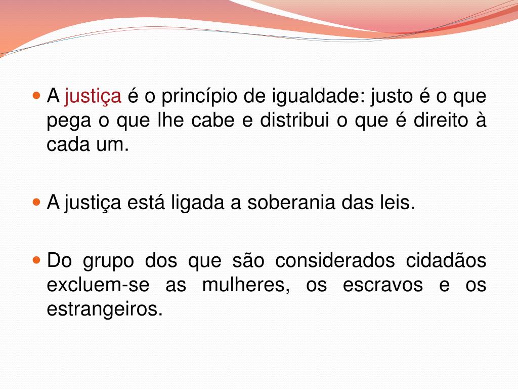 A justiça é o princípio de igualdade: justo é o que pega o que lhe cabe e distribui o que é direito à cada um. • A justiça está ligada a soberania das leis. • Do grupo dos que são considerados cidadãos excluem-se as mulheres, os escravos e os estrangeiros.