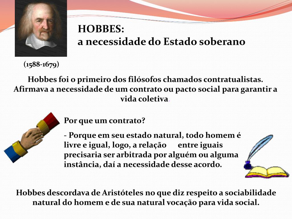 HOBBES: a necessidade do Estado soberano (1588-1679) Hobbes foi o primeiro dos filósofos chamados contratualistas. Afirmava a necessidade de um contrato ou pacto social para garantir a vida coletiva. Por que um contrato? - Porque em seu estado natural, todo homem é livre e igual, logo, a relação entre iguais precisaria ser arbitrada por alguém ou alguma instância, daí a necessidade desse acordo. Hobbes descordava de Aristóteles no que diz respeito a sociabilidade natural do homem e de sua natural vocação para vida social.