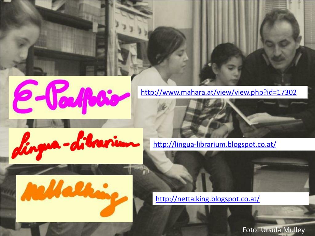 http://www.mahara.at/view/view.php?id=17302 http://lingua-librarium.blogspot.co.at/ http://nettalking.blogspot.co.at/ Foto: Ursula Mulley