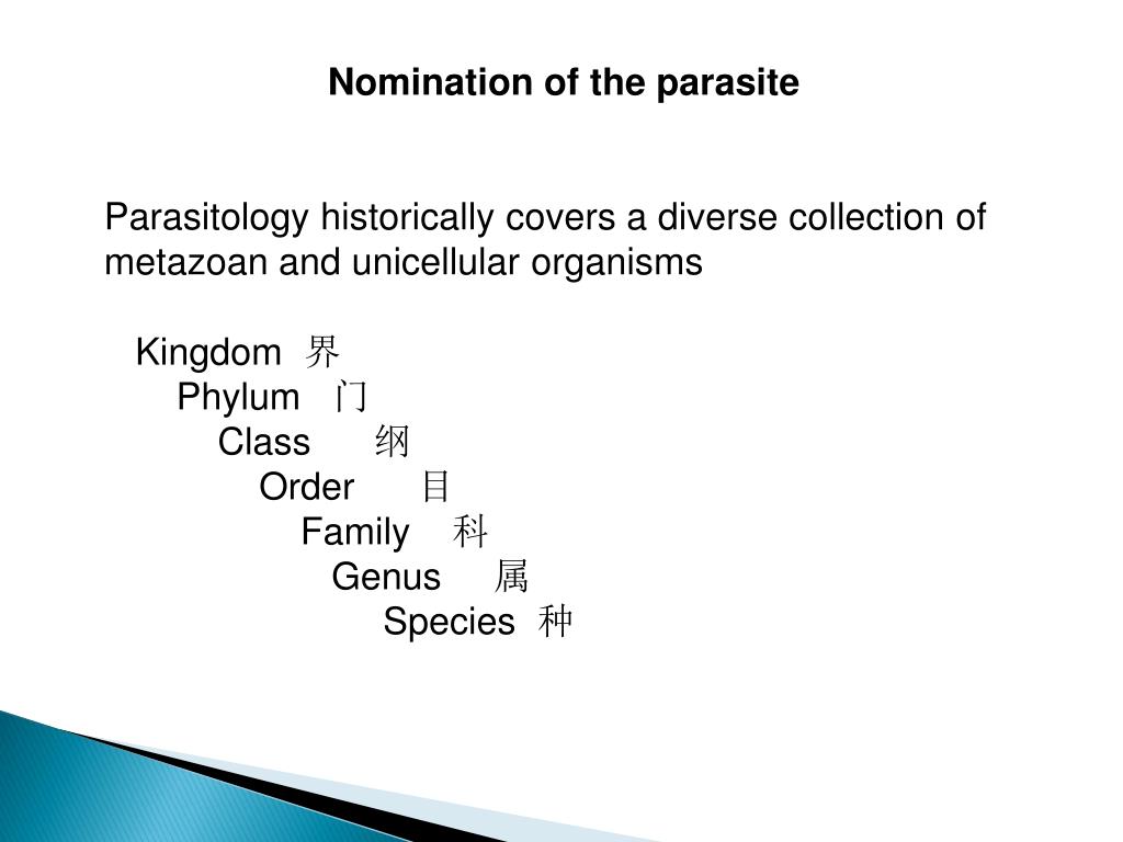 Nomination of the parasite Parasitology historically covers a diverse collection of metazoan and unicellular organisms Kingdom 界 Phylum 门 Class 纲 Order 目 Family 科 Genus 属 Species 种