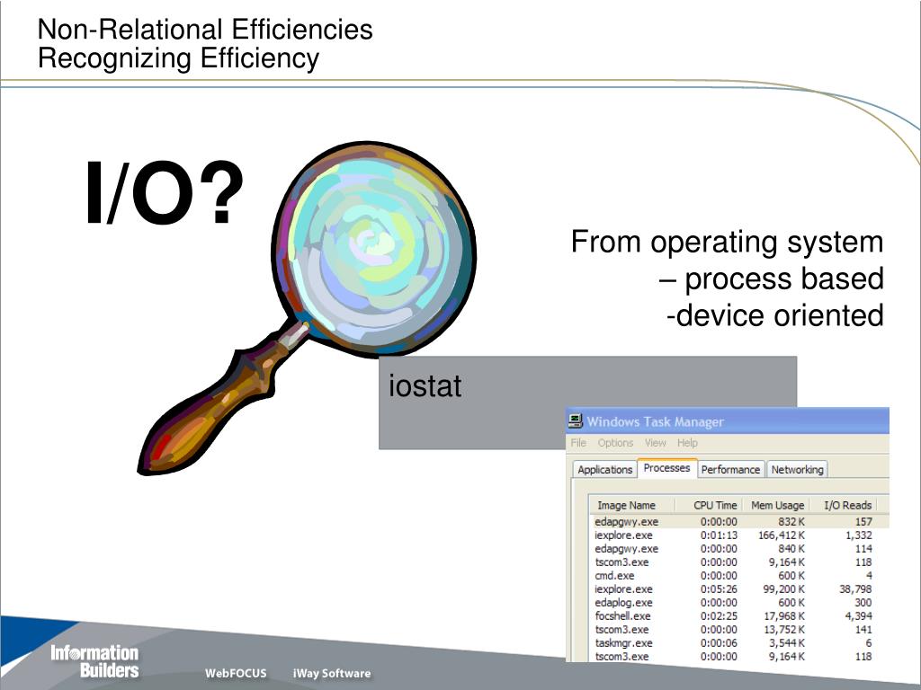 Non-Relational EfficienciesRecognizing Efficiency I/O? From operating system – process based -device oriented iostat