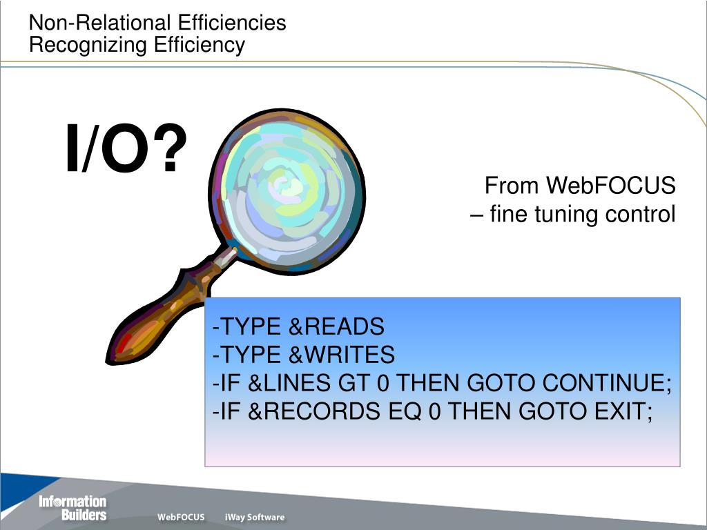 Non-Relational EfficienciesRecognizing Efficiency I/O? • From WebFOCUS • – fine tuning control -TYPE &READS -TYPE &WRITES -IF &LINES GT 0 THEN GOTO CONTINUE; -IF &RECORDS EQ 0 THEN GOTO EXIT;