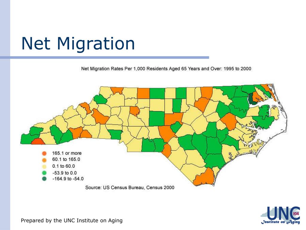Older Adults Migrate to North Carolina Number of adults age 60+ who lived in a different state 5 years earlier Source of data: 1970-1990 data from Dr. Charles Longino; 2000 data from Internal Migration of the Older Population: 1995 to 2000 (CENSR-10). Prepared by the UNC Institute on Aging