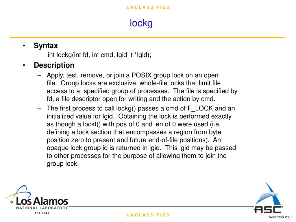 lockg • Syntax int lockg(int fd, int cmd, lgid_t *lgid); • Description • Apply, test, remove, or join a POSIX group lock on an open file. Group locks are exclusive, whole-file locks that limit file access to a specified group of processes. The file is specified by fd, a file descriptor open for writing and the action by cmd. • The first process to call lockg() passes a cmd of F_LOCK and an initialized value for lgid. Obtaining the lock is performed exactly as though a lockf() with pos of 0 and len of 0 were used (i.e. defining a lock section that encompasses a region from byte position zero to present and future end-of-file positions). An opaque lock group id is returned in lgid. This lgid may be passed to other processes for the purpose of allowing them to join the group lock.
