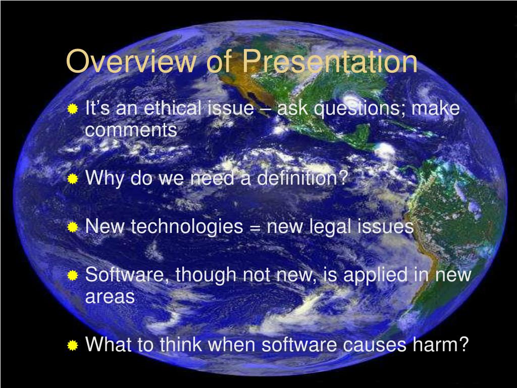 Overview of Presentation • It’s an ethical issue – ask questions; make comments • Why do we need a definition? • New technologies = new legal issues • Software, though not new, is applied in new areas • What to think when software causes harm?