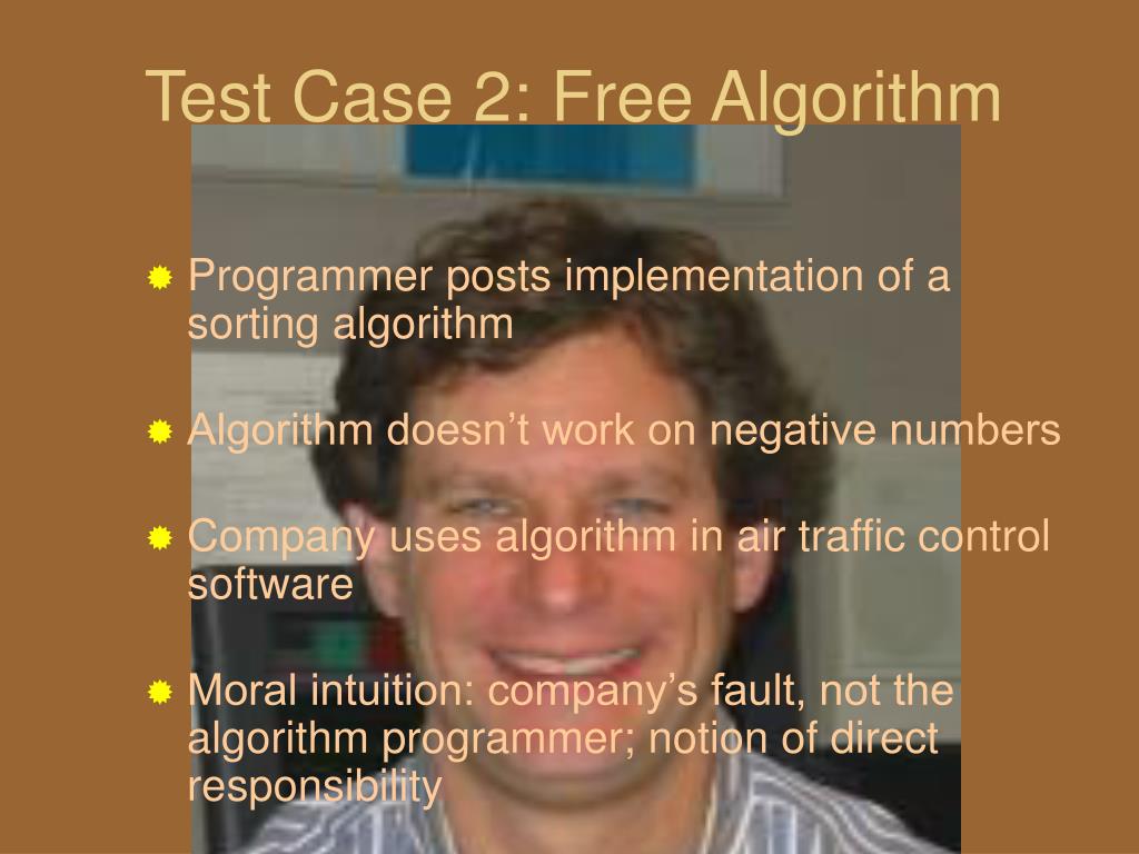 Test Case 2: Free Algorithm • Programmer posts implementation of a sorting algorithm • Algorithm doesn’t work on negative numbers • Company uses algorithm in air traffic control software • Moral intuition: company’s fault, not the algorithm programmer; notion of direct responsibility