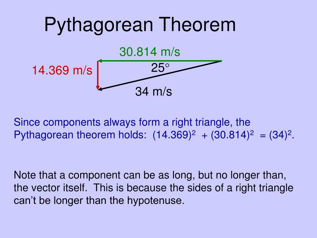 Pythagorean Theorem 30.814 m/s 25 14.369 m/s 34 m/s Since components always form a right triangle, the Pythagorean theorem holds: (14.369)2 + (30.814)2 = (34)2. Note that a component can be as long, but no longer than, the vector itself. This is because the sides of a right triangle can’t be longer than the hypotenuse.