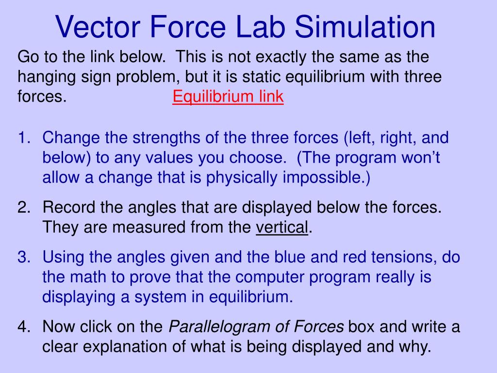 Vector Force Lab Simulation Go to the link below. This is not exactly the same as the hanging sign problem, but it is static equilibrium with three forces.Equilibrium link • Change the strengths of the three forces (left, right, and below) to any values you choose. (The program won’t allow a change that is physically impossible.) • Record the angles that are displayed below the forces. They are measured from the vertical. • Using the angles given and the blue and red tensions, do the math to prove that the computer program really is displaying a system in equilibrium. • Now click on the Parallelogram of Forces box and write a clear explanation of what is being displayed and why.