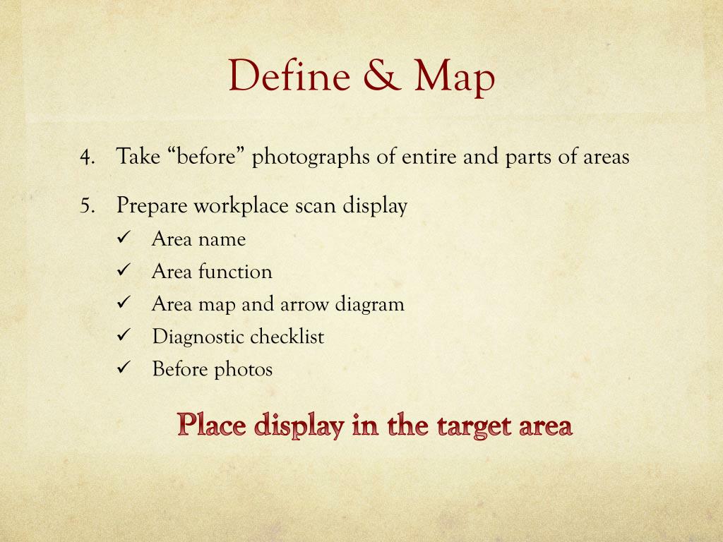 Define & Map • Take “before” photographs of entire and parts of areas • Prepare workplace scan display • Area name • Area function • Area map and arrow diagram • Diagnostic checklist • Before photos Place display in the target area