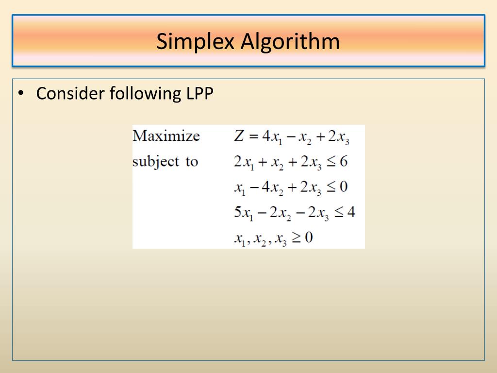 Simplex Algorithm …contd. Basic feasible solution of above canonical form is x4 = 6, x5= 0, x6= 4 , x1= x2= x3= 0 and Z= 0 Set of equations, including the objective function is to be transformed to canonical form