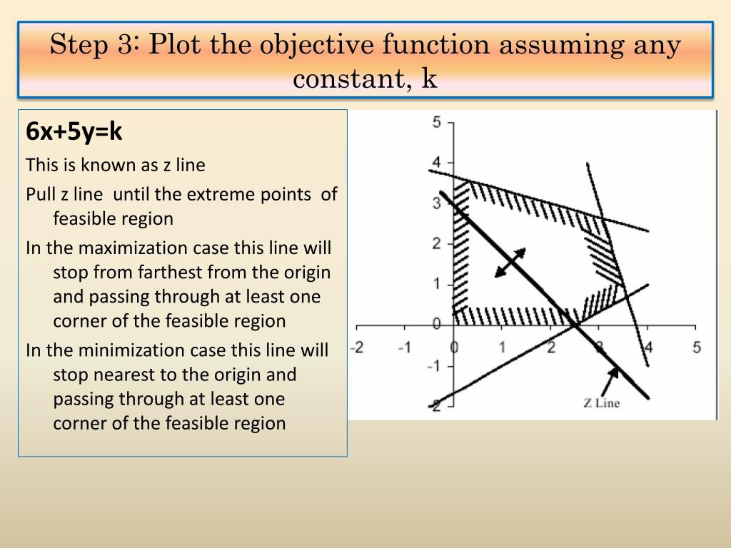 Step 3: Plot the objective function assuming any constant, k 6x+5y=k This is known as z line Pull z line until the extreme points of feasible region In the maximization case this line will stop from farthest from the origin and passing through at least one corner of the feasible region In the minimization case this line will stop nearest to the origin and passing through at least one corner of the feasible region