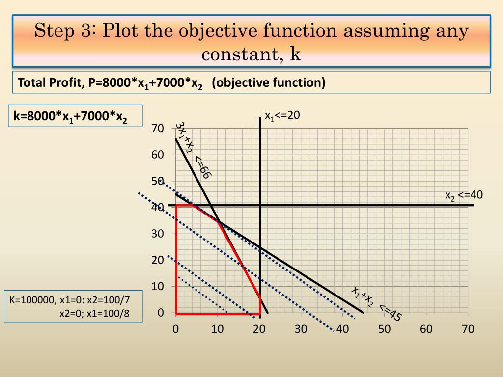Step 3: Plot the objective function assuming any constant, k Total Profit, P=8000*x1+7000*x2 (objective function) k=8000*x1+7000*x2 x1<=20 3x1+x2 <=66 x2 <=40 K=100000, x1=0: x2=100/7 x2=0; x1=100/8 x1+x2 <=45