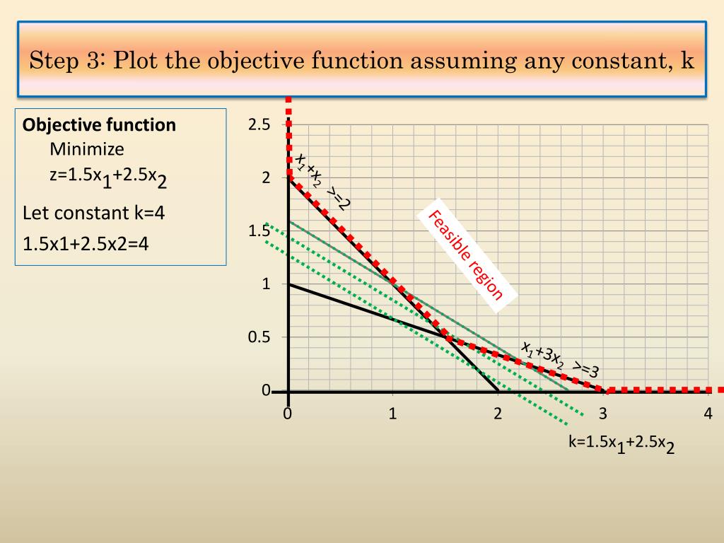 Step 3: Plot the objective function assuming any constant, k x1+x2 >=2 Feasible region x1+3x2 >=3 k=1.5x1+2.5x2 Objective function Minimize z=1.5x1+2.5x2 Let constant k=4 1.5x1+2.5x2=4