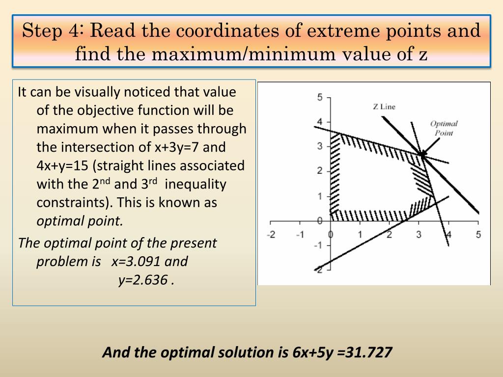 Step 4: Read the coordinates of extreme points and find the maximum/minimum value of z And the optimal solution is 6x+5y =31.727 It can be visually noticed that value of the objective function will be maximum when it passes through the intersection of x+3y=7 and 4x+y=15 (straight lines associated with the 2nd and 3rd inequality constraints). This is known as optimal point. The optimal point of the present problem is x=3.091 and y=2.636 .