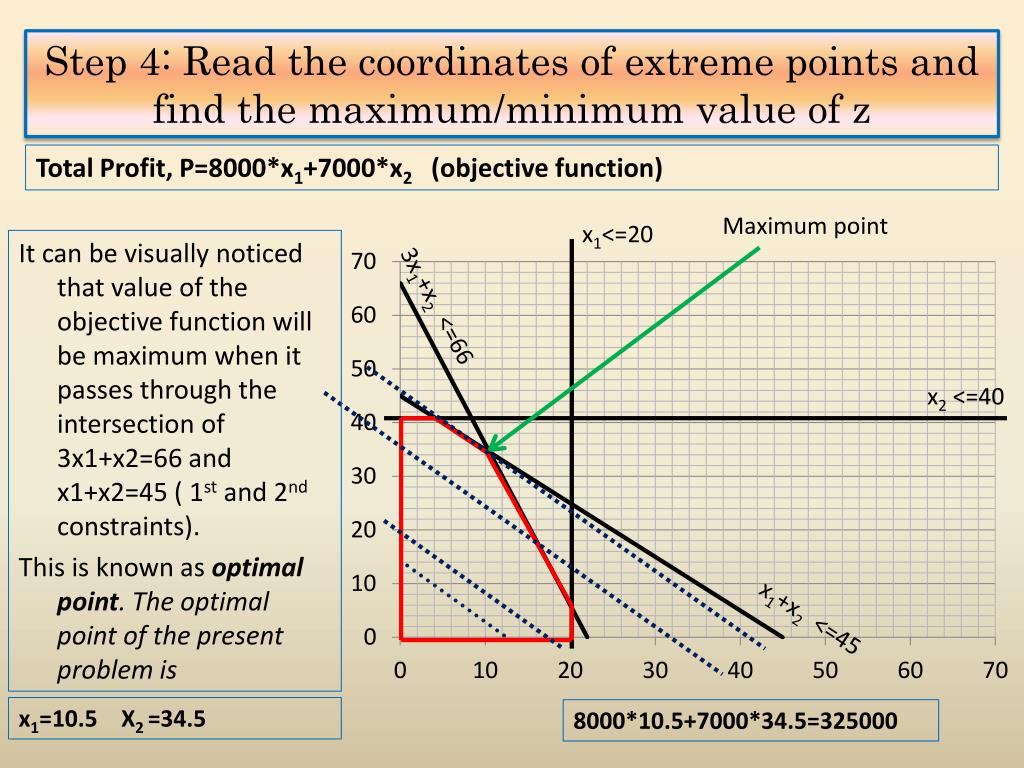 Step 4: Read the coordinates of extreme points and find the maximum/minimum value of z Total Profit, P=8000*x1+7000*x2 (objective function) Maximum point x1<=20 3x1+x2 <=66 x2 <=40 x1+x2 <=45 x1=10.5 X2 =34.5 8000*10.5+7000*34.5=325000 It can be visually noticed that value of the objective function will be maximum when it passes through the intersection of 3x1+x2=66 and x1+x2=45 ( 1st and 2nd constraints). This is known asoptimal point. The optimal point of the present problem is