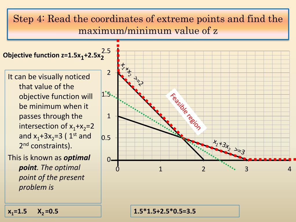 Step 4: Read the coordinates of extreme points and find the maximum/minimum value of z Objective function z=1.5x1+2.5x2 x1+x2 >=2 Feasible region x1+3x2 >=3 x1=1.5 X2 =0.5 1.5*1.5+2.5*0.5=3.5 It can be visually noticed that value of the objective function will be minimum when it passes through the intersection of x1+x2=2 and x1+3x2=3 ( 1st and 2nd constraints). This is known asoptimal point. The optimal point of the present problem is