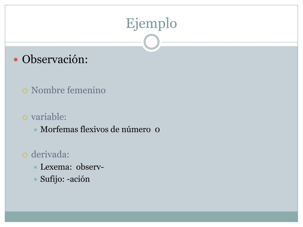 Ejemplo • Observación: • Nombre femenino • variable: • Morfemas flexivos de número 0 • derivada: • Lexema: observ- • Sufijo: -ación