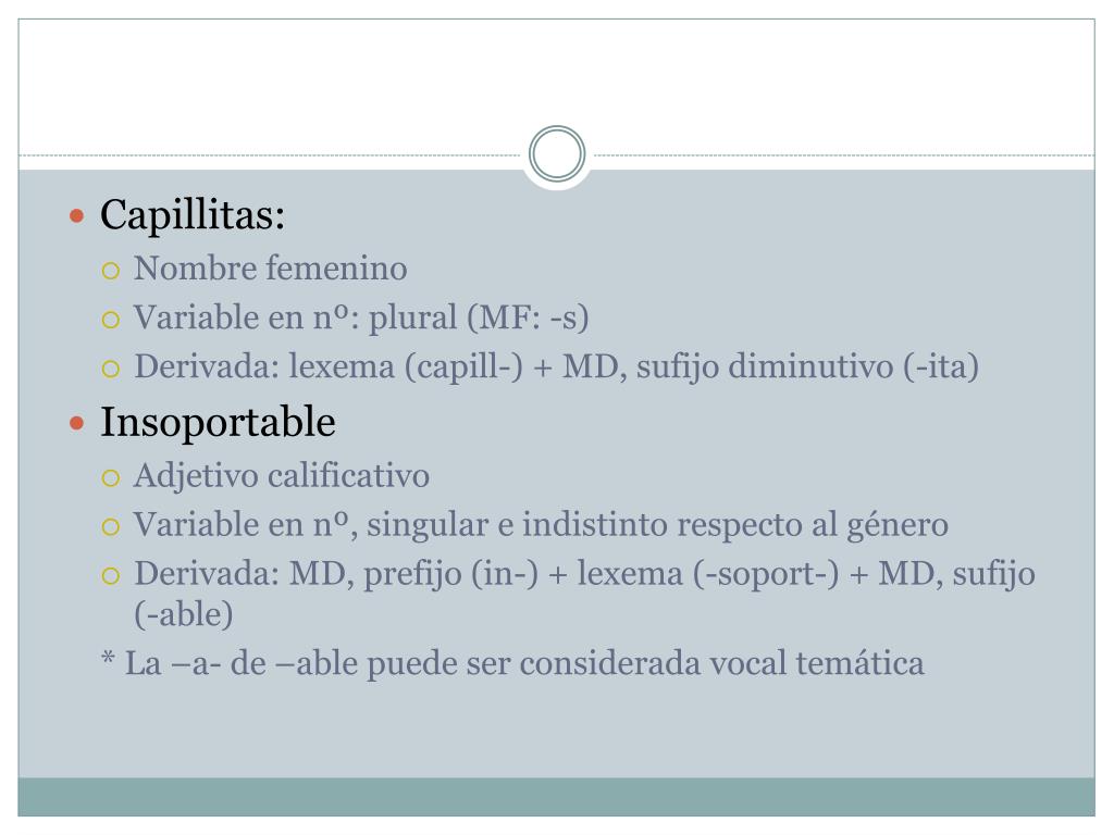 Capillitas: • Nombre femenino • Variable en nº: plural (MF: -s) • Derivada: lexema (capill-) + MD, sufijo diminutivo (-ita) • Insoportable • Adjetivo calificativo • Variable en nº, singular e indistinto respecto al género • Derivada: MD, prefijo (in-) + lexema (-soport-) + MD, sufijo (-able) * La –a- de –able puede ser considerada vocal temática
