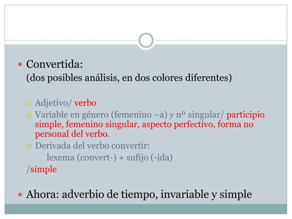 Convertida: (dos posibles análisis, en dos colores diferentes) • Adjetivo/ verbo • Variable en género (femenino –a) y nº singular/ participio simple, femenino singular, aspecto perfectivo, forma no personal del verbo. • Derivada del verbo convertir: lexema (convert-) + sufijo (-ida) /simple • Ahora: adverbio de tiempo, invariable y simple
