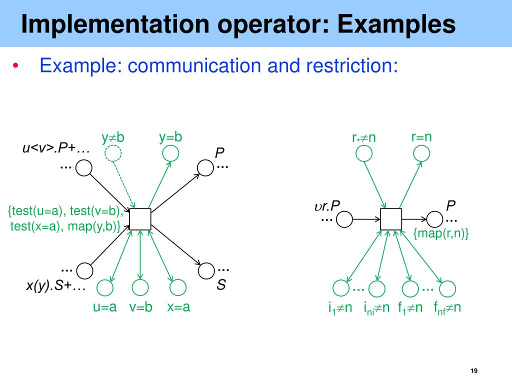 Implementation operator: Examples • Example: communication and restriction: y=b r=n yb r*n u<v>.P+… P … … r.P P {test(u=a), test(v=b), test(x=a), map(y,b)} … … {map(r,n)} … … S x(y).S+… … … u=a x=a v=b fnfn i1n inin f1n