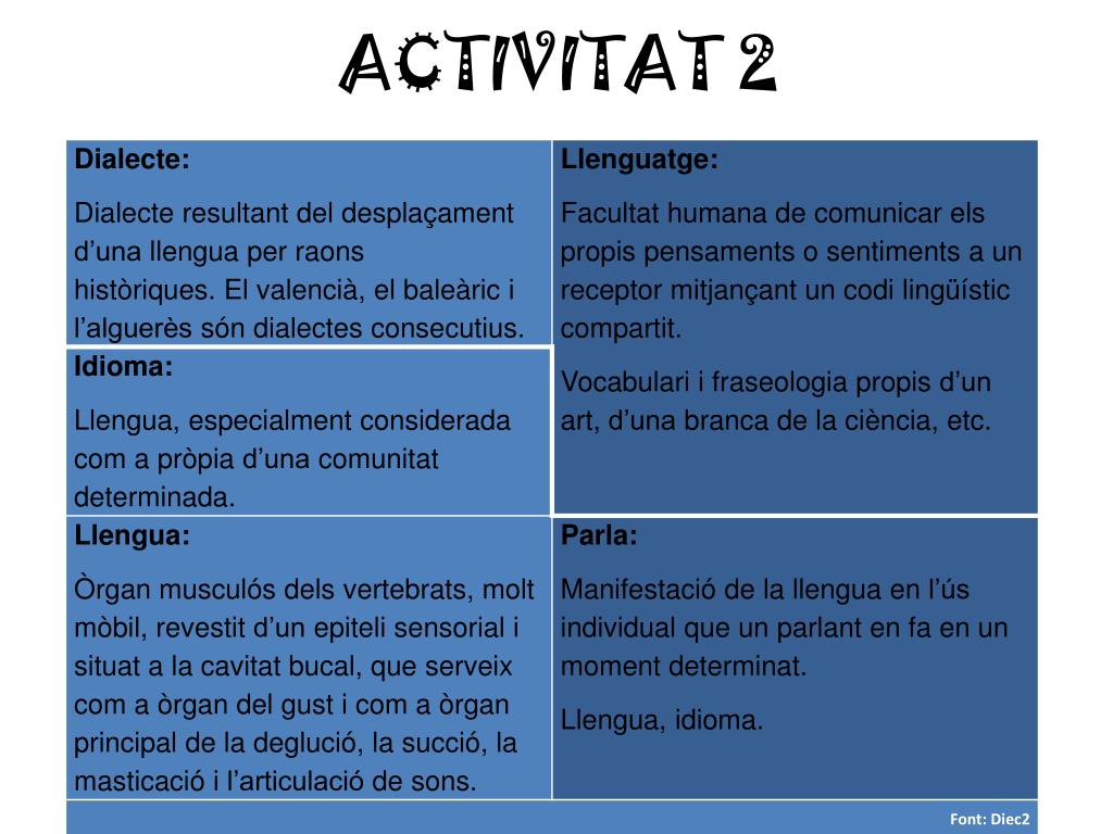 ACTIVITAT 6 LES LLENGÜES DEL MÓN Quina llenguaheutriat? Quitxuà. 2. On es parla? Amèrica. 3. Quants de parlants té? Uns9’6 milions de persones. 4. Quèus ha cridatl'atenció del que heullegit sobre aquestallengua? Que es un idioma pocconegutperòmoltparlat.