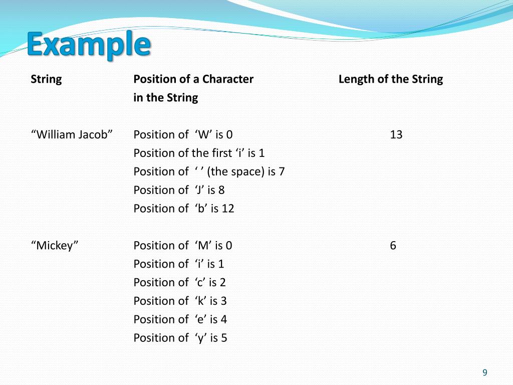 Example String Position of a Character Length of the String in the String “William Jacob” Position of ‘W’ is 0 13 Position of the first ‘i’ is 1 Position of ‘ ’ (the space) is 7 Position of ‘J’ is 8 Position of ‘b’ is 12 “Mickey” Position of ‘M’ is 0 6 Position of ‘i’ is 1 Position of ‘c’ is 2 Position of ‘k’ is 3 Position of ‘e’ is 4 Position of ‘y’ is 5
