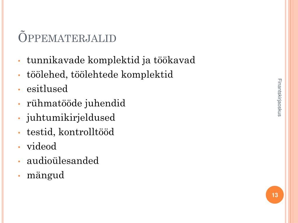Õppematerjalid • tunnikavade komplektid ja töökavad • töölehed, töölehtede komplektid • esitlused • rühmatööde juhendid • juhtumikirjeldused • testid, kontrolltööd • videod • audioülesanded • mängud Finantskirjaoskus